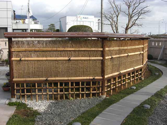 近年長持ちするように、樹脂でできた竹垣も流行しております。しなりが効くので編込み垣等、自由で面白い意匠の垣根を作り出すことができます。